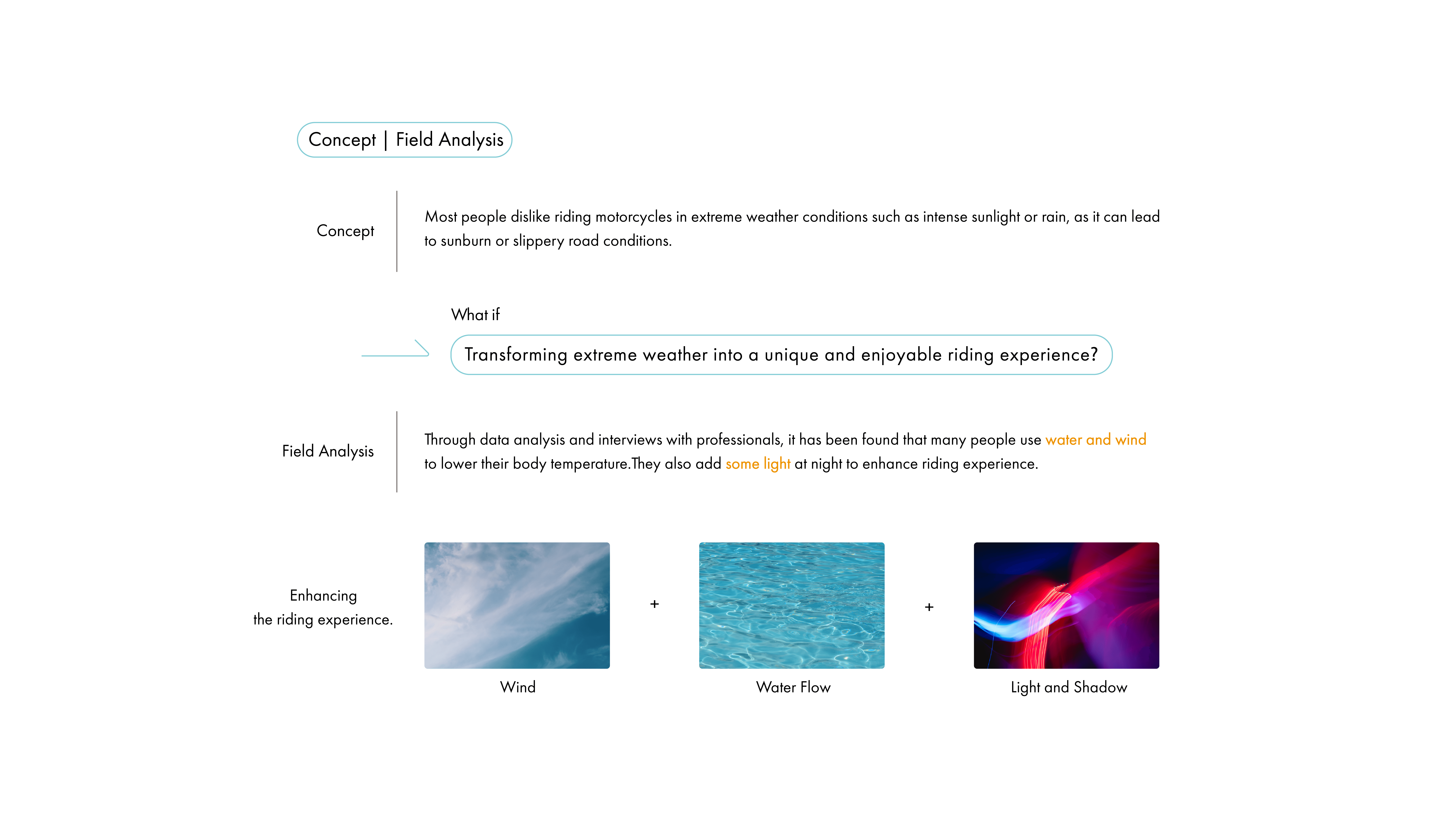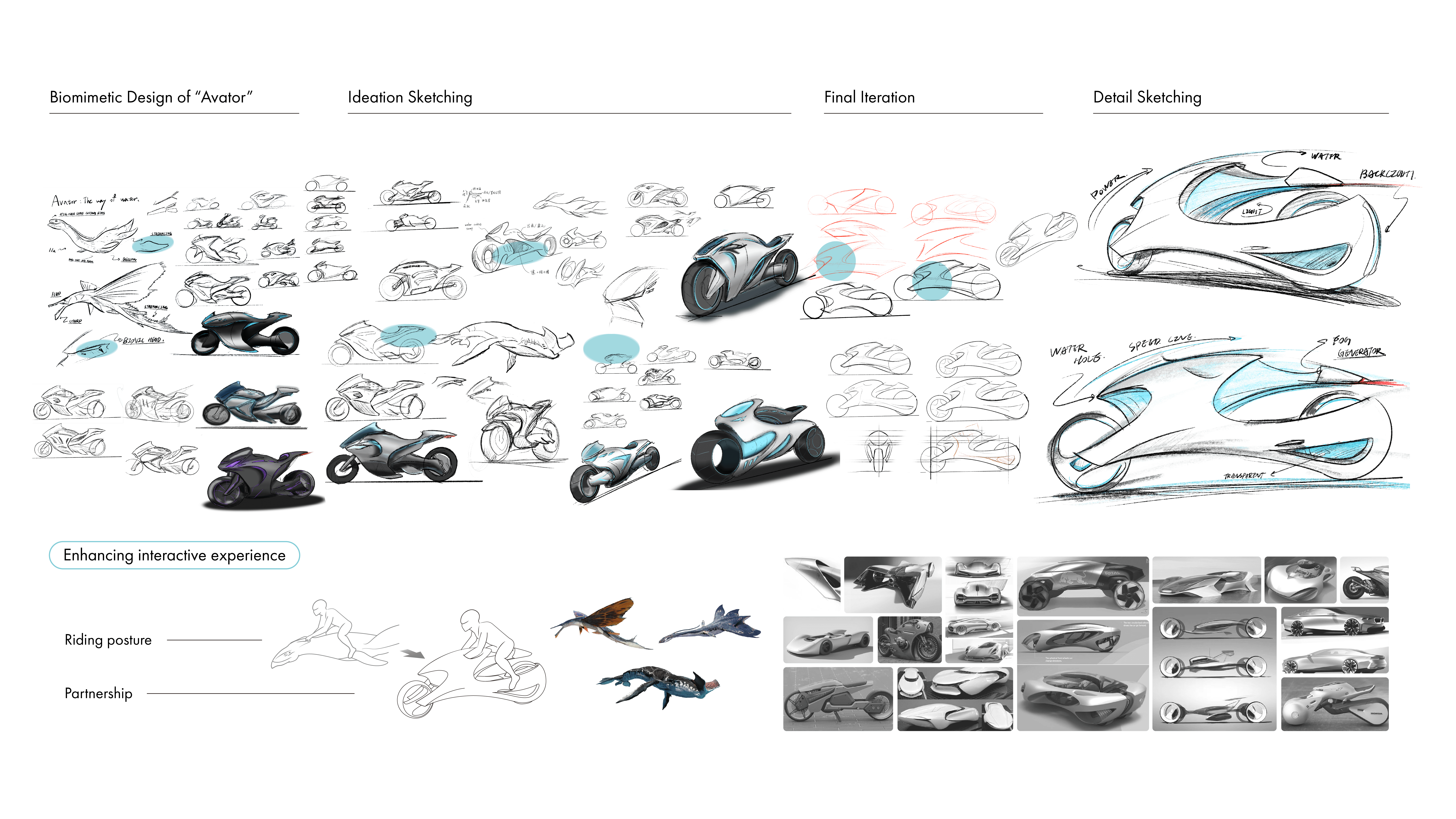 A concept motorcycle designed to adapt to various environments by incorporating water and light. These features not only serve functional purposes but also enhance the riding experience for the user.